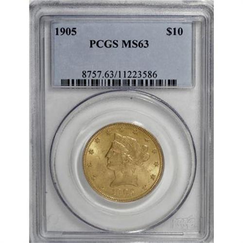 <B>1905 $10 MS63 PCGS.</B></I> An intricately struck and lightly abraded example of this somewhat scarcer date. Original green-gold toning aids the eye appeal.<BR><BR><b>Shipping:</b> Coins & Currency (<a target="_blank" href="http://www.heritageauctions.com/common/shipping.php">view shipping information</a>)