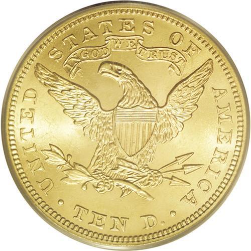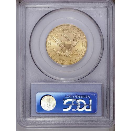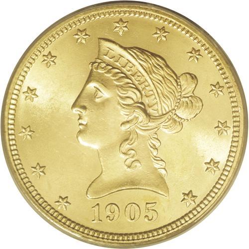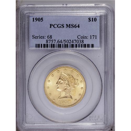 <B>1905<$10> MS64 PCGS.</B></I> Far from rare in lower grades, the 1905 (201,078 pieces produced) is still much more difficult to locate than such common Liberty half eagles as the 1899, 1901, and 1907. The 1905 is also a noteworthy condition rarity in grades above the MS63 level, and the present near-Gem offers uncommonly clean surfaces for this often noticeably abraded issue. Frosty with yellow-gold color, the coin also displays sharply impressed features. Population: 71 in 64, 15 finer (2/06).