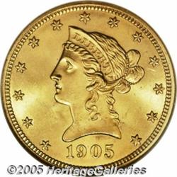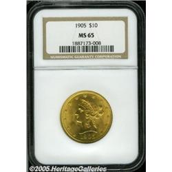 <B>1905 $10 MS65 NGC.</B></I> Although the 1905 is often grouped with the most common Liberty Eagles in the series, it is slightly more elusive than the 1899, 1901, and 1907. At the Gem level, however, perhaps only a few dozen pieces survive. The surfaces are awash in satiny luster that provides an especially vibrant appearance over both sides, being tinged in lemon-yellow and orange patina. Every feature is boldly defined and there isn't a single abrasion worthy of individual mention. Population: 16 in 65, 15 finer (2/05).