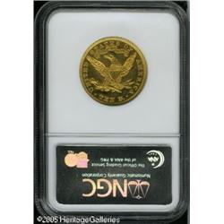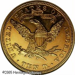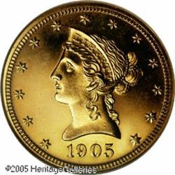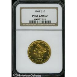 <B>1905 $10 PR65 Cameo NGC.</B></I> The 1905 is a rare date as a proof with only 86 pieces struck. Of that number, Akers estimates that perhaps only 25-30 still exist while Breen states that some 30-35 may still be extant. He considers the 1905 "very rare," more so than the issues of 1900, 1902, and 1904, and on par with the 1903. High grade examples are especially elusive.<BR> This is a very attractive piece that shows light field-to-device contrast which is quite unusual, as most of the proofs struck during the early 1900s were the non-contrasting variety. Deeply reflective mirrored pools of reflectivity are seen in the fields and there are only the slightest, wispy hairlines on either side. Some hazy, milky patina has accumulated overall. For identification purposes, a very thin scratch is noted from the base of Liberty's hair bun past star 11 to the rim. Currently, both services combined have seen five Cameo Gems, with two finer at NGC (1/05). Lot:8845
