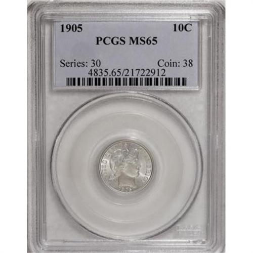 <B>1905 10C MS65 PCGS.</B></I> Radiant luster emanates from the silver-white surfaces of this gorgeous Gem dime. An attentive strike impresses the design elements, and the few obverse marks are consistent with the grade. Population: 20 in 65, 4 finer (1/08).<BR><I>From The Southwest Collection.</B></I><BR><BR><B>Coin Engraver:</B> Charles E. Barber<BR><BR><b>Shipping:</b> Coins & Currency (<a target="_blank" href="http://www.heritageauctions.com/common/shipping.php">view shipping information</a>)