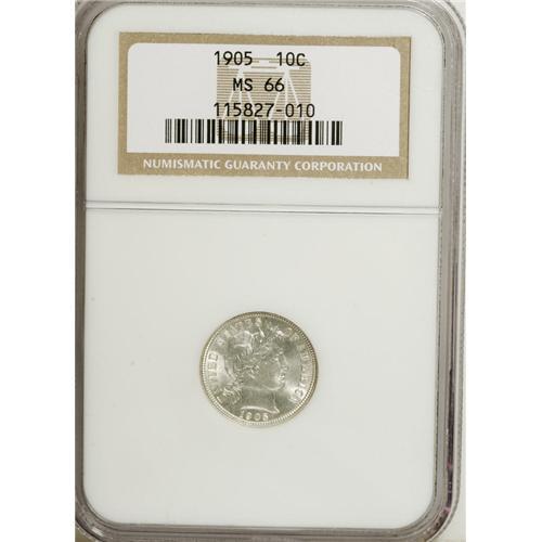 <B>1905 10C MS66 NGC.</B></I> Radiantly lustrous with brilliant, bright white surfaces. The design elements are crisply impressed. Minor die clash marks are noted on each side, but they are too faint to be distracting. Surface blemishes are minimal, as expected. Census: 4 in 66, 2 finer (4/07).<BR><BR><b>Shipping:</b> Coins & Currency (<a target="_blank" href="http://www.heritageauctions.com/common/shipping.php">view shipping information</a>)