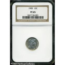1905 10C PR65 NGC. Faint honey patina graces the o <B>1905 10C PR65 NGC.</B></I> Faint honey patina graces the obverse margin, but this beautiful Gem is otherwise fully brilliant. The reverse features obvious cameo contrast, although not designated as such on the NGC insert. The portrait provides mild but noticeable contrast. The 05 in the date is repunched north. Population: 30 in 65, 54 finer (11/04). <BR><BR><B>Important notice:</B> Heritage usually auctions material at the rate of 200-250 lots per hour. On some occasions eBay Live bid software or the Internet may not be able to keep up with the pace of the auction. We recommend placing a realistic absentee bid now as insurance to avoid disappointment. Occasionally the auctioneer may eliminate or reject an eBay Live bid, and the auctioneer may also reopen a lot after the close of the eBay live bidding (usually because we missed an audience bid), and may reject your bid even if it shows you as the winning bidder. By bidding via eBay Live, you agree that Heritage may award the lot to another bidder at its sole discretion under the circumstances described above or any other reasonable circumstances. Since eBay bids are not shown to us until we open the lot on the floor, we treat those bids just like floor bids. In most cases the floor responds before the eBay bid is presented to us, due to Internet lag time, so for consistency we have made it a policy that floor bids are always considered first over tie eBay live bids. Also please note that all Heritage lots purchased through eBay Live carry a 20% Buyer's Premium. Please make sure you read the Terms and Conditions before you bid. This lot is being auctioned in conjunction with a live floor auction by Heritage Galleries & Auctioneers. All final auction and invoice information will be supplied by Heritage Galleries & Auctioneers, and all other information should be considered preliminary. Lot:5793