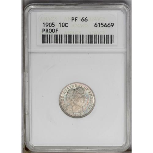 <B>1905<10C> PR66 ANACS.</B></I> This sharply struck Barber dime exhibits some cameo tendencies. Cobalt-blue, lilac, and subtle gold-tan colors bathe each side, and the surfaces are nicely preserved throughout.