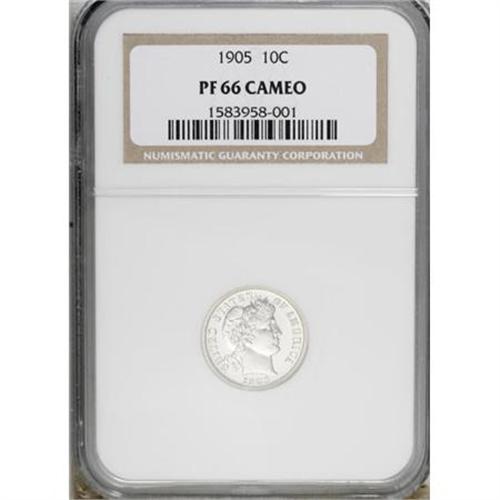<B>1905 10C PR66 Cameo NGC. CAC.</B></I> Excellent contrast for this 20th century proof Barber issue. The decisively struck devices and gleaming, minimally toned fields are beautifully preserved. Census: 1 in 66 Cameo, 8 finer (11/07).<BR><BR><b>Shipping:</b> Coins & Currency (<a target="_blank" href="http://www.heritageauctions.com/common/shipping.php">view shipping information</a>)