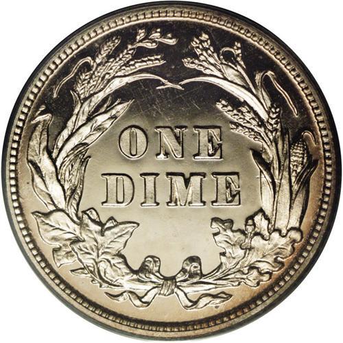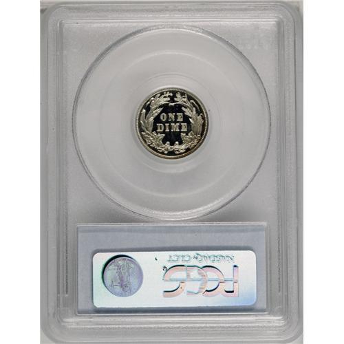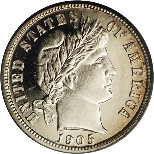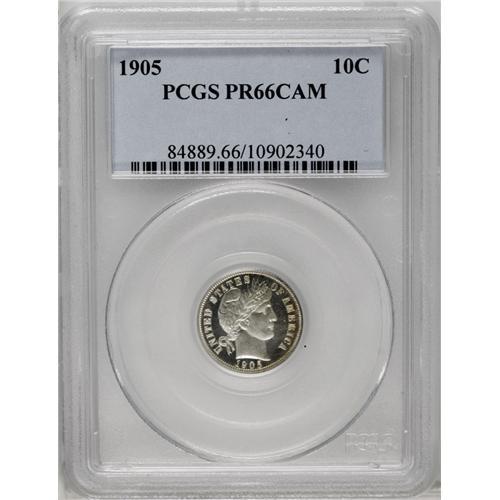 <B>1905<10C> PR66 Cameo PCGS.</B></I> Razor-sharp striking details are noted on both sides of this gorgeous proof dime. The snow-white frosted devices are starkly contrasted over watery, jet-black fields. A slight degree of golden-brown peripheral toning only improves the already splendid eye appeal. Carefully preserved for more than a hundred years, and nearly pristine. Population: 8 in 66 Cameo, 3 finer (3/06).