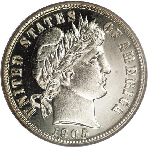 <B>1905<10C> PR66 Cameo PCGS.</B></I> This is a sharply defined and fully brilliant Gem proof example with exquisite Cameo contrast. Both sides are fully brilliant with no evidence of toning. A small patch of hairlines in the reverse field keep this from Superb Gem quality. Population: 8 in 66, 3 finer (4/06).