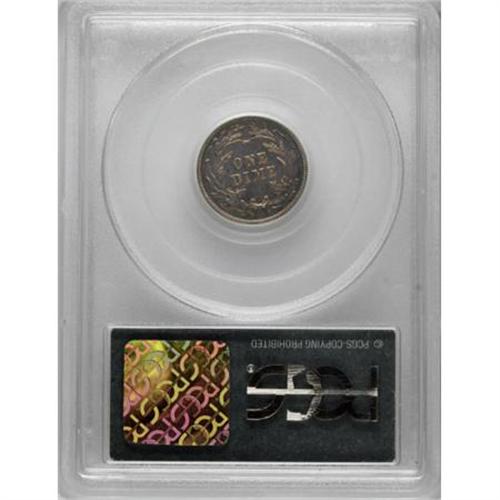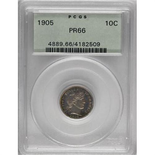 <B>1905 10C PR66 PCGS.</B></I> Boldly struck with watery fields and attractive mint-green, mauve, and charcoal-gray toning. Other than a single curly lintmark (as struck) on each side of the piece, the surfaces are seemingly pristine. One of just 727 specimens coined. Population: 37 in 66, 14 finer (6/07).<BR><BR><B>Coin Engraver:</B> Charles E. Barber<BR><BR><b>Shipping:</b> Coins & Currency (<a target="_blank" href="http://www.heritageauctions.com/common/shipping.php">view shipping information</a>\)