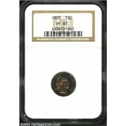 1905 10C PR67 NGC. The surfaces are essentially perfect and deeply mirrored. Both sides are richly toned with golden-rose centers with deep blue, speckled peripheries. An immaculate type coin. Population: 16 in 67, 4 finer (2/03). Important notice: We expect to be auctioning lots at the rate of 200-250 per hour. On occasion eBay live bid software cannot keep up with the pace of the auctions where 4-5 lots per minute can hammer down, so we recommend that you place a realistic absentee bid now as insurance to avoid disappointment. Also please note that all Heritage/CAA lots purchased through eBay Live carry a 20% Buyer's Premium. Please make sure you read the Terms and Conditions.