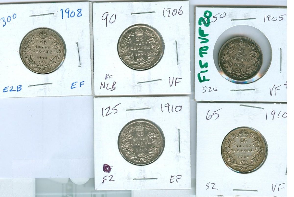 1905, 1906, 1908 and 1910 (2) 25¢. Lot of 5 coins F15 to VF20. Should be viewed.