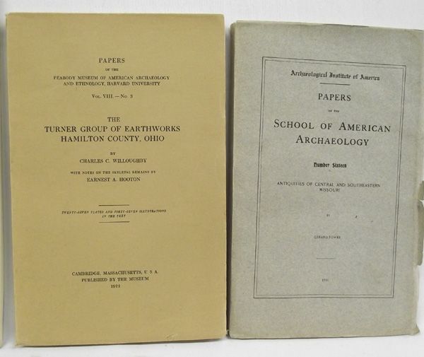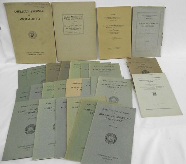 1905-1949 Ethnology and Archeology Pamphlets. The Bureau of Americann Ethnology pamphlets include the years: 1933-34, 1934-35, 1935-36(2), 1936-37(2), 1937-38, 1938-39(2), 1939-40(2), 1940-41(2), 1942-43(2), 1943-44(2), 1944-45(2), 1945-46, 1946-47(2), 1948-49. There are also the following pamphlets: 1905 The Wisconsin Archeologist, 1910 Papers of the School of American Archaeology, 1922 Papers of the Peabody Museum of American Archaeology and Ethnology, 1923 ''Certain Mounds and Village Sites in Ohio, 1940 University of New Mexico Bulletin, 1949 American Journal of Archaeology (largest pamphelt in the group at 8'' x 11''). All are in fair to good condition for age.