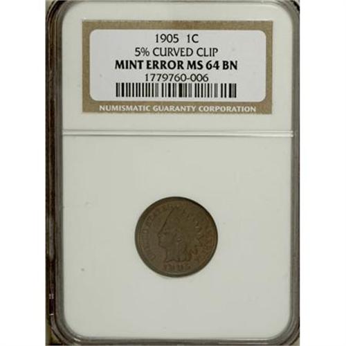 <B>1905 1C Cent--5% Curved Clip--MS64 Brown NGC.</B></I> <BR><BR><B>Coin Engraver:</B> James B. Longacre<BR><BR><b>Shipping:</b> Coins & Currency (<a target="_blank" href="http://www.heritageauctions.com/common/shipping.php">view shipping information</a>)