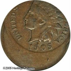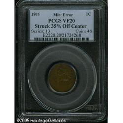 <B>1905 1C Indian Cent--Struck 35% Off Center--VF20 PCGS.</B></I> Struck off center at 1 o'clock. Attractive olive-brown color with hints of darker toning.<BR><I>From The Larry Rausch Collection, Part Three.</B></I> Lot:10832