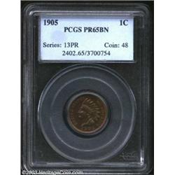 1905 1C PR65 Brown PCGS. The "brown" surfaces easily display vivid underlying iridescent colors of bright-green and crimson, when the coin is turned beneath a light. No distracting hairlines or handling marks are to be seen. An attractive, conditionally scarce proof Gem. Population: 5 in 65, 1 finer (1/03). Important notice: We expect to be auctioning lots at the rate of 200-250 per hour. On occasion eBay live bid software cannot keep up with the pace of the auctions where 4-5 lots per minute can hammer down, so we recommend that you place a realistic absentee bid now as insurance to avoid disappointment. Also please note that all Heritage/CAA lots purchased through eBay Live carry a 20% Buyer's Premium. Please make sure you read the Terms and Conditions.