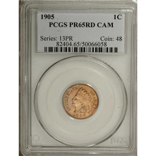 <B>1905 1C PR65 Red Cameo PCGS.</B></I> The cameo contrast on this Gem takes on a wonderful copper-gold-on-black appearance. A well executed strike translates into crisp definition on the design features, including most of the feather tips and on all four diamonds. Impeccably preserved surfaces reveal no significant abrasions or flecks. <BR> The 1905 proof comes with a relatively high mintage of 2,152 pieces, though few fully red, cameoed coins are known. Indeed, PCGS has graded a mere six specimens of such coins. Population: 3 in 65 Red Cameo, 2 finer (11/07).<BR><I>From The New York Eye Appeal Collection, Part Three.</B></I><BR><BR><b>Shipping:</b> Coins & Currency (<a target="_blank" href="http://www.heritageauctions.com/common/shipping.php">view shipping information</a>)