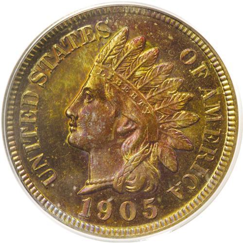 1905 1C PR65 Red and Brown PCGS. Daubs of gold, green,