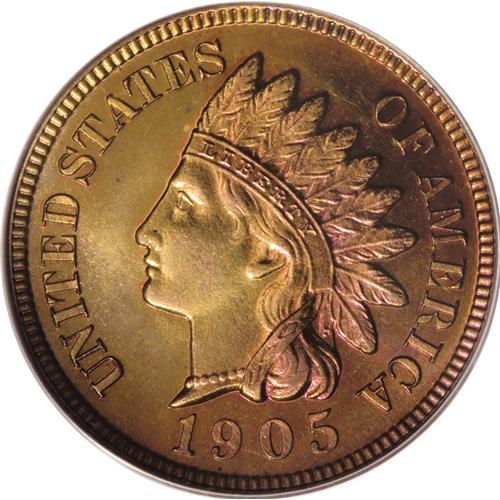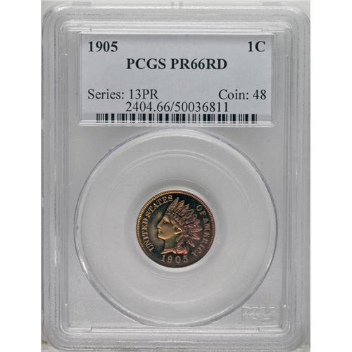 <B>1905 1C PR66 Red PCGS.</B></I> Cherry-red dominates the right obverse border, and also adorns the upper reverse margin. This well struck and flashy Premium Gem is void of contact, and has only trivial carbon. Only a tiny fraction of the proof mintage has survived as full Red. Population: 13 in 66 Red, 2 finer (2/07).<BR><BR><b>Shipping:</b> Coins & Currency (<a target="_blank" href="http://www.heritageauctions.com/common/shipping.php">view shipping information</a>)