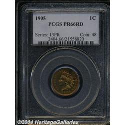 <B>1905<1C> PR66 Red PCGS.</B></I> Spectacular orange and red iridescence on both sides, with intense and nearly flawless proof surfaces. Population: 13 in 66, 2 finer (3/04). <BR><BR><B>Important notice:</B> Heritage usually auctions material at the rate of 200-250 lots per hour. On some occasions eBay Live bid software or the Internet may not be able to keep up with the pace of the auction. We recommend placing a realistic absentee bid now as insurance to avoid disappointment. Occasionally the auctioneer may eliminate or reject an eBay Live bid, and the auctioneer may also reopen a lot after the close of the eBay live bidding (usually because we missed an audience bid), and may reject your bid even if it shows you as the winning bidder. By bidding via eBay Live, you agree that Heritage may award the lot to another bidder at its sole discretion under the circumstances described above or any other reasonable circumstances. Since eBay bids are not shown to us until we open the lot on the floor, we treat those bids just like floor bids. In most cases the floor responds before the eBay bid is presented to us, due to Internet lag time, so for consistency we have made it a policy that floor bids are always considered first over tie eBay live bids. Also please note that all Heritage lots purchased through eBay Live carry a 20% Buyer's Premium. Please make sure you read the Terms and Conditions before you bid.