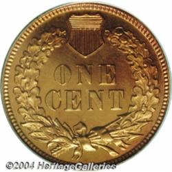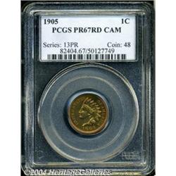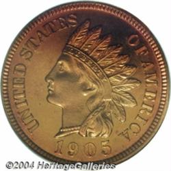 <B>1905<1C> PR67 Red Cameo PCGS.</B></I> The difference between a typical Gem quality proof Indian cent, and one at the extremely scarce PR67 Red Cameo level, can be easily distinguished on this fiery orange-red, glowing specimen. Although its technical merits are on full display, it is the coin's wondrous eye appeal that sticks with the viewer. The marvelously deep reflectivity in the fields lends itself well to the production of Cameo contrast, on both the obverse and the reverse. To date, this is the only coin certified at the lofty PR67 Red Cameo grade level, by PCGS, and there are none finer at either of the major services (7/04). <BR><BR><B>Important notice:</B> Heritage usually auctions material at the rate of 200-250 lots per hour. On some occasions eBay Live bid software or the Internet may not be able to keep up with the pace of the auction. We recommend placing a realistic absentee bid now as insurance to avoid disappointment. Occasionally the auctioneer may eliminate or reject an eBay Live bid, and the auctioneer may also reopen a lot after the close of the eBay live bidding (usually because we missed an audience bid), and may reject your bid even if it shows you as the winning bidder. By bidding via eBay Live, you agree that Heritage may award the lot to another bidder at its sole discretion under the circumstances described above or any other reasonable circumstances. Since eBay bids are not shown to us until we open the lot on the floor, we treat those bids just like floor bids. In most cases the floor responds before the eBay bid is presented to us, due to Internet lag time, so for consistency we have made it a policy that floor bids are always considered first over tie eBay live bids. Also please note that all Heritage lots purchased through eBay Live carry a 20% Buyer's Premium. Please make sure you read the Terms and Conditions before you bid. </span></font></tr></table></td></tr></table>