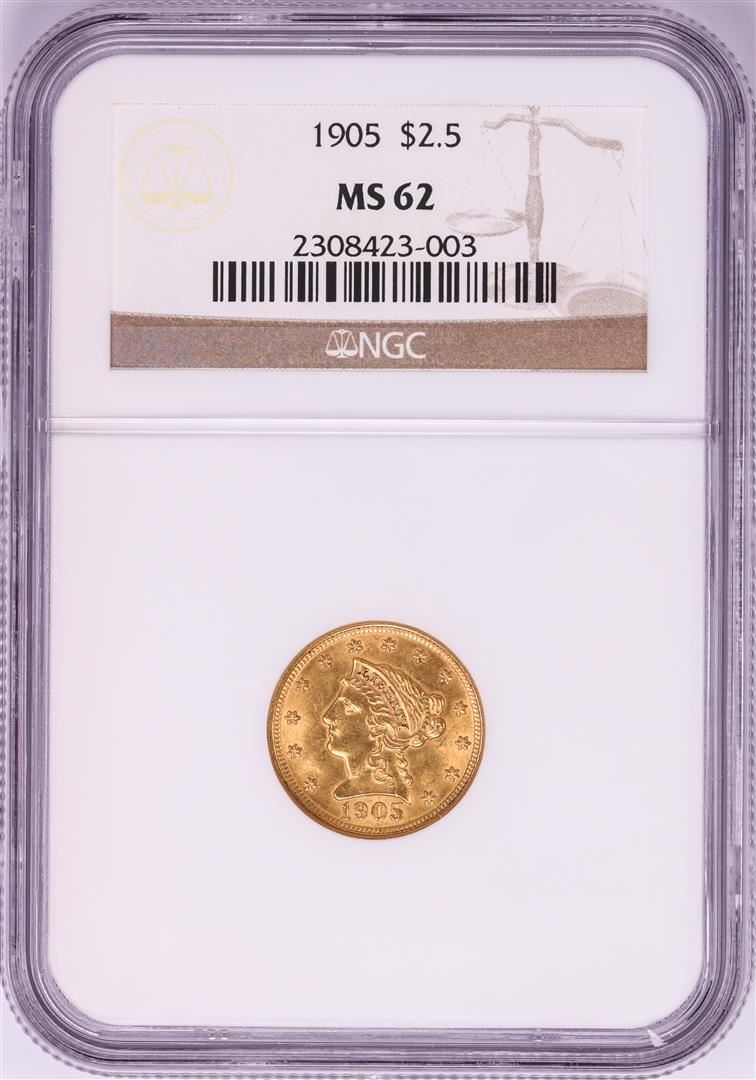 One 1905 $2 1/2 Liberty Head Quarter Eagle Gold Coin NGC MS62. NGC Certified.