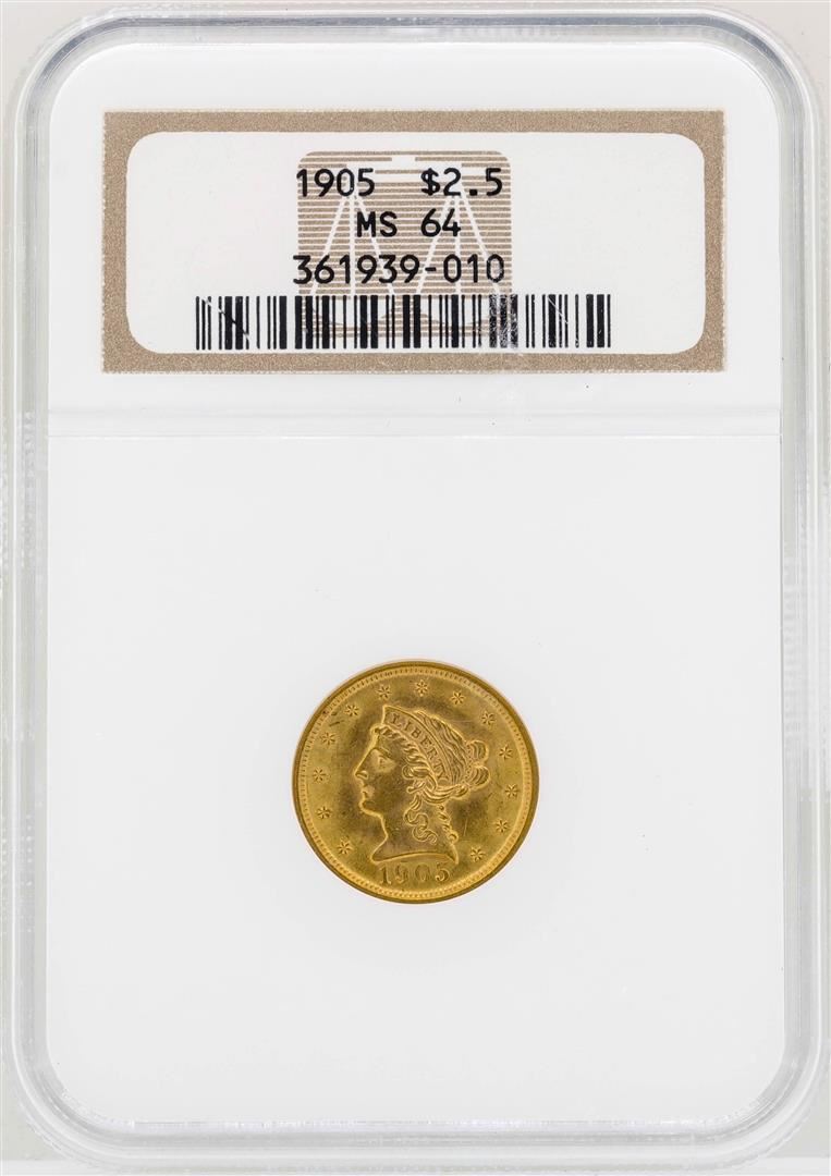One 1905 $2 1/2 Liberty Head Quarter Eagle Gold Coin NGC MS64. NGC Certified.