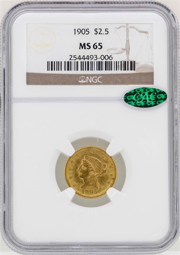 One 1905 $2 1/2 Liberty Head Quarter Eagle Gold Coin NGC MS65 CAC. NGC Certified.