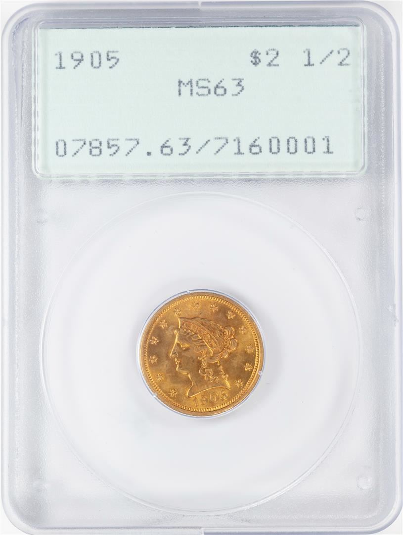 One 1905 $2 1/2 Liberty Head Quarter Eagle Gold Coin PCGS MS63 Old Green Rattler. PCGS Graded.