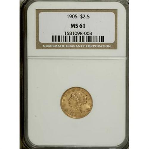 <B>1905 $2 1/2 MS61 NGC.</B></I> NGC Census: (366/3762). PCGS Population (322/4075). Mintage: 217,800. Numismedia Wsl. Price for NGC/PCGS coin in MS61: $365. (#7857)<BR><BR><B>Coin Engraver:</B> Christian Gobrecht<BR><BR><b>Shipping:</b> Coins & Currency (<a target="_blank" href="http://www.heritageauctions.com/common/shipping.php">view shipping information</a>)