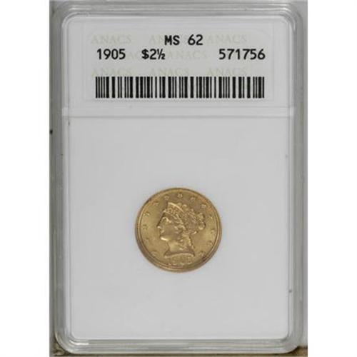 <B>1905 $2 1/2 MS62 ANACS.</B></I> . NGC Census: (1043/2862). PCGS Population (987/3171). Mintage: 217,800. Numismedia Wsl. Price for NGC/PCGS coin in MS62: $455. (#7857)<BR><BR><B>Coin Engraver:</B> Christian Gobrecht<BR><BR><b>Shipping:</b> Coins & Currency (<a target="_blank" href="http://www.heritageauctions.com/common/shipping.php">view shipping information</a>)