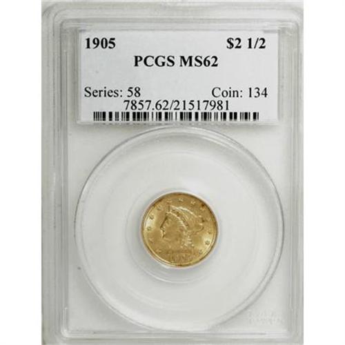 <B>1905 $2 1/2 MS62 PCGS.</B></I> PCGS Population (980/3140). NGC Census: (1031/2834). Mintage: 217,800. Numismedia Wsl. Price for NGC/PCGS coin in MS62: $455. (#7857)<BR><BR><B>Coin Engraver:</B> Christian Gobrecht<BR><BR><b>Shipping:</b> Coins & Currency (<a target="_blank" href="http://www.heritageauctions.com/common/shipping.php">view shipping information</a>)