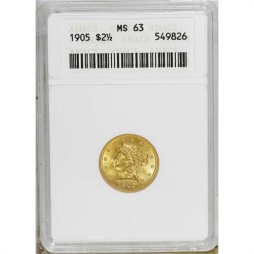 <B>1905 $2 1/2 MS63 ANACS.</B></I> NGC Census: (960/1904). PCGS Population (1352/1829). Mintage: 217,800. Numismedia Wsl. Price for NGC/PCGS coin in MS63: $1,200. (#7857)<BR><BR><B>Coin Engraver:</B> Christian Gobrecht<BR><BR><b>Shipping:</b> Coins & Currency (<a target="_blank" href="http://www.heritageauctions.com/common/shipping.php">view shipping information</a>)