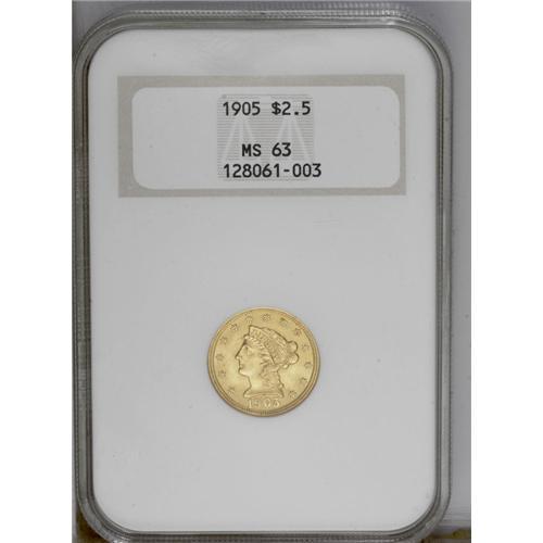 <B>1905 $2 1/2 MS63 NGC.</B></I> Seemingly conservatively graded with smooth, uninterrupted luster in the fields and relatively unscathed central motifs. Several faint slide marks are noted across Liberty's portrait, but hardly detract from the appeal.
