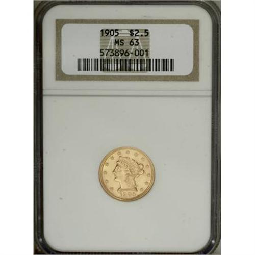 <B>1905 $2 1/2 MS63 NGC.</B></I> NGC Census: (941/1873). PCGS Population (1340/1792). Mintage: 217,800. Numismedia Wsl. Price for NGC/PCGS coin in MS63: $725. (#7857)<BR><BR><B>Coin Engraver:</B> Christian Gobrecht<BR><BR><b>Shipping:</b> Coins & Currency (<a target="_blank" href="http://www.heritageauctions.com/common/shipping.php">view shipping information</a>)