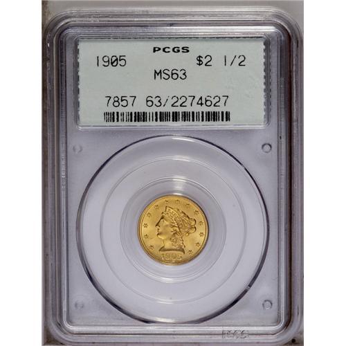 <B>1905<$2 1/2> MS63 PCGS.</B></I> Both sides display a bold strike and a deep, hard sheen uniformly covering the surfaces. Above average eye appeal for the grade. <BR><BR><B>Important notice:</B> Heritage usually auctions material at the rate of 200-250 lots per hour. On some occasions eBay Live bid software or the Internet may not be able to keep up with the pace of the auction. We recommend placing a realistic absentee bid now as insurance to avoid disappointment. Occasionally the auctioneer may eliminate or reject an eBay Live bid, and the auctioneer may also reopen a lot after the close of the eBay live bidding (usually because we missed an audience bid), and may reject your bid even if it shows you as the winning bidder. By bidding via eBay Live, you agree that Heritage may award the lot to another bidder at its sole discretion under the circumstances described above or any other reasonable circumstances. Since eBay bids are not shown to us until we open the lot on the floor, we treat those bids just like floor bids. In most cases the floor responds before the eBay bid is presented to us, due to Internet lag time, so for consistency we have made it a policy that floor bids are always considered first over tie eBay live bids. Also please note that all Heritage lots purchased through eBay Live carry a 20% Buyer's Premium. Please make sure you read the Terms and Conditions before you bid. This lot is being auctioned in conjunction with a live floor auction by Heritage Galleries & Auctioneers. All final auction and invoice information will be supplied by Heritage Galleries & Auctioneers, and all other information should be considered preliminary. Lot:2454 <BR><BR><B>Winning Notification and Billing:</B> After the FINAL session in this auction is complete, Heritage will send e-mail and snail mail invoices. This process normally takes several days. All final auction and invoice information will be supplied by Heritage Galleries & Auctioneers, and all other information should be considered preliminary. <BR><BR>This auction will be conducted on a live auction floor and over the Internet through eBay Live. If you choose to place an absentee bid, please take a moment to <font color='#0000ff'><u><a href='http://pages.ebay.com/liveauctions/help/before/laabsentee.html'>learn how eBay Live absentee bidding works</a></u></font><font color='#000000'>