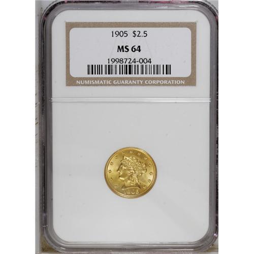 <B>1905<$2 1/2> MS64 NGC.</B></I> A luscious lemon-yellow near-Gem that sports orange accents. Crisply struck with vibrant luster and a handful of marks that limit the grade.