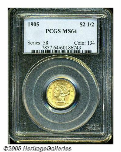 <B>1905<$2 1/2> MS64 PCGS.</B></I> The 1905 is one of the most common dates of the series. On this specimen, lustrous greenish-gold surfaces exhibit well struck design elements. A few trivial marks on Liberty's cheek and neck, and in the upper reverse field, are not bothersome.
