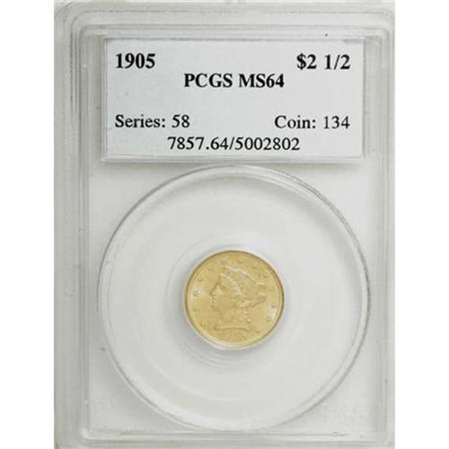 <B>1905 $2 1/2 MS64 PCGS.</B></I> PCGS Population (1043/757). NGC Census: (1030/858). Mintage: 217,800. Numismedia Wsl. Price for NGC/PCGS coin in MS64: $1,080. (#7857)<BR><BR><B>Coin Engraver:</B> Christian Gobrecht<BR><BR><b>Shipping:</b> Coins & Currency (<a target="_blank" href="http://www.heritageauctions.com/common/shipping.php">view shipping information</a>)