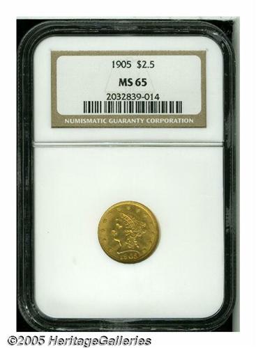 <B>1905<$2 1/2> MS65 NGC.</B></I> The 1905 is one of the most common dates of the series. On this specimen, lustrous greenish-gold surfaces exhibit well struck design elements. A few trivial marks on Liberty's cheek and neck are not bothersome.<BR><I>From the Dr. Kurt Peters Collection.</B></I> From the Dr. Kurt Peters Collection.