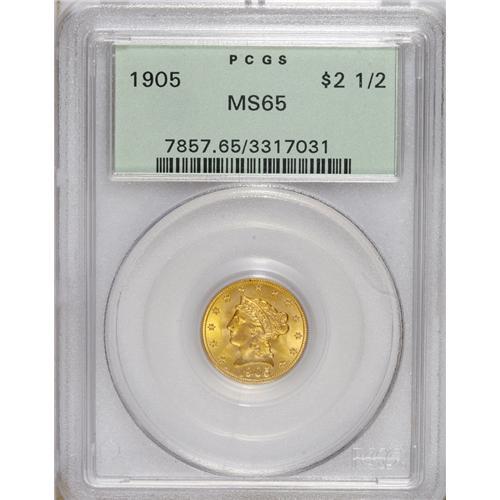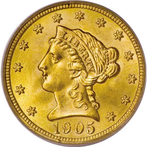 <B>1905 $2 1/2 MS65 PCGS.</B></I> Well struck with dynamic luster and deep green-gold and copper-orange toning. The impressive surfaces are undisturbed by any sizeable marks. According to Jeff Garrett and Ron Guth (2006): "The 1905 Liberty Head quarter eagle is a very common date for the series. Thousands have been graded in Mint State by the major services."<BR><BR><b>Shipping:</b> Coins & Currency (<a target="_blank" href="http://www.heritageauctions.com/common/shipping.php">view shipping information</a>)