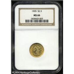 1905 $2 1/2 MS66 NGC. Pleasing orange-gold patina <B>1905 $2 1/2 MS66 NGC.</B></I> Pleasing orange-gold patina bathes smooth surfaces that emit radiant luster. The well struck design elements further enhance the eye appeal of this gorgeous piece. Small marks on Liberty's cheek and temple are mentioned for accuracy. <BR><BR><B>Important notice:</B> Heritage usually auctions material at the rate of 200-250 lots per hour. On some occasions eBay Live bid software or the Internet may not be able to keep up with the pace of the auction. We recommend placing a realistic absentee bid now as insurance to avoid disappointment. Occasionally the auctioneer may eliminate or reject an eBay Live bid, and the auctioneer may also reopen a lot after the close of the eBay live bidding (usually because we missed an audience bid), and may reject your bid even if it shows you as the winning bidder. By bidding via eBay Live, you agree that Heritage may award the lot to another bidder at its sole discretion under the circumstances described above or any other reasonable circumstances. Since eBay bids are not shown to us until we open the lot on the floor, we treat those bids just like floor bids. In most cases the floor responds before the eBay bid is presented to us, due to Internet lag time, so for consistency we have made it a policy that floor bids are always considered first over tie eBay live bids. Also please note that all Heritage lots purchased through eBay Live carry a 20% Buyer's Premium. Please make sure you read the Terms and Conditions before you bid. This lot is being auctioned in conjunction with a live floor auction by Heritage Galleries & Auctioneers. All final auction and invoice information will be supplied by Heritage Galleries & Auctioneers, and all other information should be considered preliminary. Lot:6530