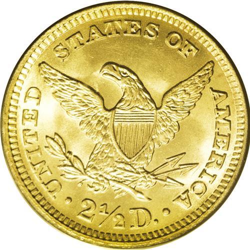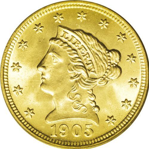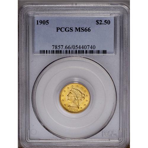 <B>1905<$2 1/2> MS66 PCGS.</B></I> Light in color with a bright golden-yellow tinge, razor sharp definition on the devices, and good surface quality. The luster on this exceptional Liberty quarter eagle is shimmering and bright. One tiny abrasion is noted on Liberty's cheek under close examination.