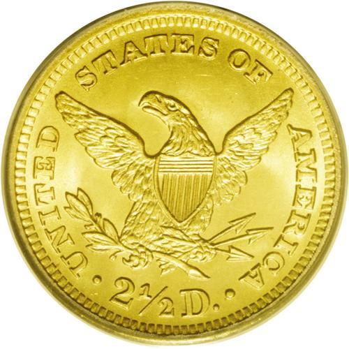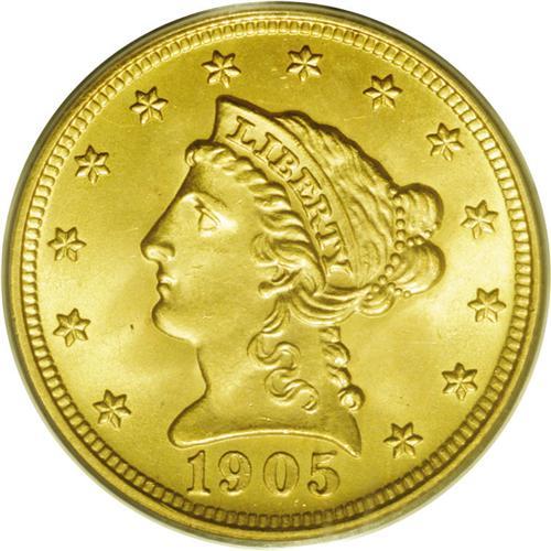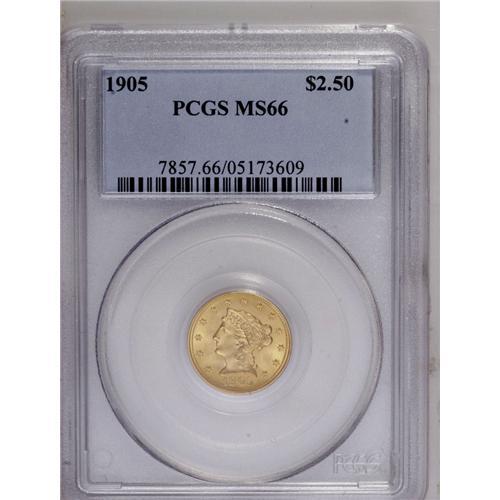 <B>1905<$2 1/2> MS66 PCGS.</B></I> Well struck with extremely bright satiny luster, pretty yellow-orange color, and a total absence of surface distractions. A very appealing and technically impressive Premium Gem. Although not as popular as the Indian quarter eagle series, Liberty quarter eagles are more affordable in high Mint State grades such as this.