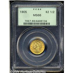 <B>1905<$2 1/2> MS66 PCGS.</B></I> Light in color with a bright golden-yellow tinge, razor sharp definition on the devices, and good surface quality. The luster on this exceptional Liberty Quarter Eagle is shimmering and bright. One tiny abrasion is noted on Liberty's cheek under close examination.<BR><I>From The Greenwich Collection, Part One.</B></I> <BR><BR><B>Important notice:</B> Heritage usually auctions material at the rate of 200-250 lots per hour. On some occasions eBay Live bid software or the Internet may not be able to keep up with the pace of the auction. We recommend placing a realistic absentee bid now as insurance to avoid disappointment. Occasionally the auctioneer may eliminate or reject an eBay Live bid, and the auctioneer may also reopen a lot after the close of the eBay live bidding (usually because we missed an audience bid), and may reject your bid even if it shows you as the winning bidder. By bidding via eBay Live, you agree that Heritage may award the lot to another bidder at its sole discretion under the circumstances described above or any other reasonable circumstances. Since eBay bids are not shown to us until we open the lot on the floor, we treat those bids just like floor bids. In most cases the floor responds before the eBay bid is presented to us, due to Internet lag time, so for consistency we have made it a policy that floor bids are always considered first over tie eBay live bids. Also please note that all Heritage lots purchased through eBay Live carry a 20% Buyer's Premium. Please make sure you read the Terms and Conditions before you bid.