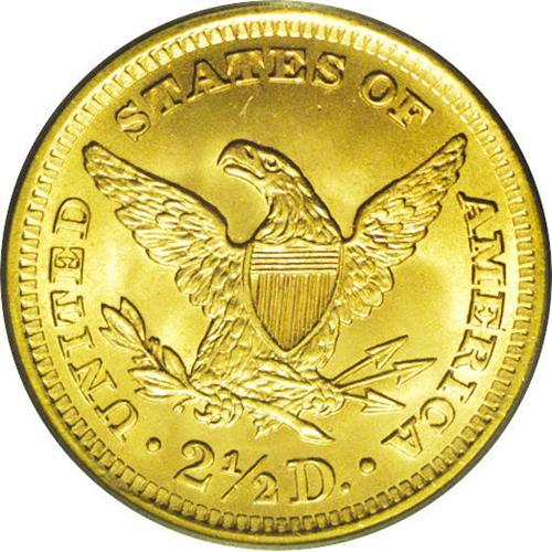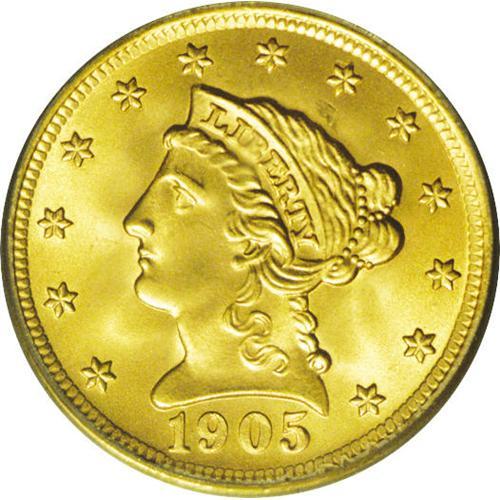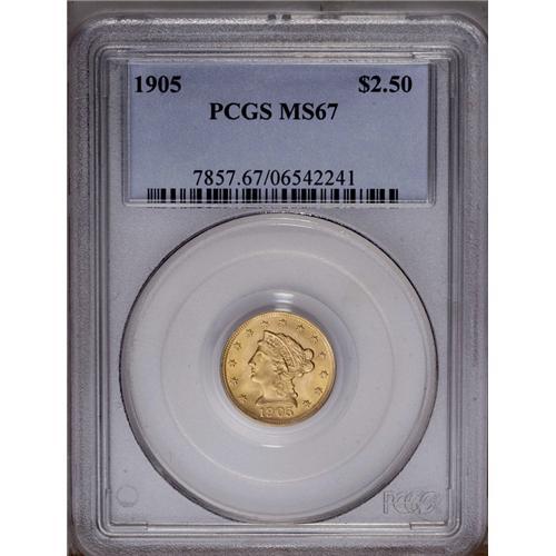 <B>1905<$2 1/2> MS67 PCGS.</B></I> The 1905 is one of the most common dates of the series, and is fairly available through the MS65 grade level, and even Premium Gems can be obtained with a little searching. MS67 and finer pieces are much more challenging. This Superb Gem displays lovely satiny luster and honey-gold color, and has sharply struck design elements. A couple of minor luster grazes on Liberty's cheek and in the upper right obverse field do not distract. Population: 42 in 67, 1 finer (4/06).