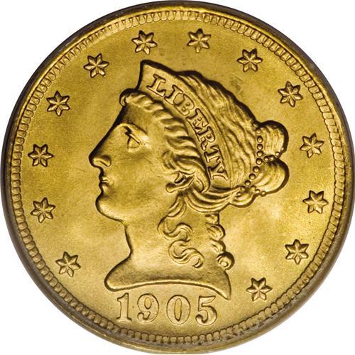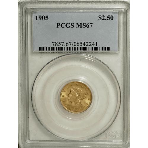 <B>1905 $2 1/2 MS67 PCGS.</B></I> The 1905 is one of the most frequently seen dates of the series, and is fairly available through the MS65 grade level, and even Premium Gems can be obtained with a little searching. MS67 and finer pieces are much more challenging. This Superb Gem displays lovely satiny luster and bright yellow-gold color, and has sharply struck design elements. An essentially perfect type coin. Population: 45 in 67, 1 finer (3/07).<BR><BR><b>Shipping:</b> Coins & Currency (<a target="_blank" href="http://www.heritageauctions.com/common/shipping.php">view shipping information</a>)