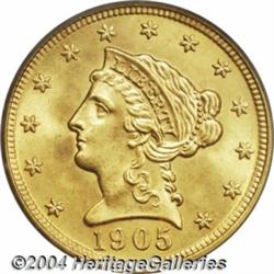 <B>1905<$2 1/2> MS67 PCGS.</B></I> Pristine surfaces are devoid of any noticeable marks and the smooth, satiny luster is subtly colored in shades of light yellow-gold and deeper reddish-orange. Population: 36 in 67, 0 finer (7/04). <BR><BR><B>Important notice:</B> Heritage usually auctions material at the rate of 200-250 lots per hour. On some occasions eBay Live bid software or the Internet may not be able to keep up with the pace of the auction. We recommend placing a realistic absentee bid now as insurance to avoid disappointment. Occasionally the auctioneer may eliminate or reject an eBay Live bid, and the auctioneer may also reopen a lot after the close of the eBay live bidding (usually because we missed an audience bid), and may reject your bid even if it shows you as the winning bidder. By bidding via eBay Live, you agree that Heritage may award the lot to another bidder at its sole discretion under the circumstances described above or any other reasonable circumstances. Since eBay bids are not shown to us until we open the lot on the floor, we treat those bids just like floor bids. In most cases the floor responds before the eBay bid is presented to us, due to Internet lag time, so for consistency we have made it a policy that floor bids are always considered first over tie eBay live bids. Also please note that all Heritage lots purchased through eBay Live carry a 20% Buyer's Premium. Please make sure you read the Terms and Conditions before you bid. </span></font></tr></table></td></tr></table>
