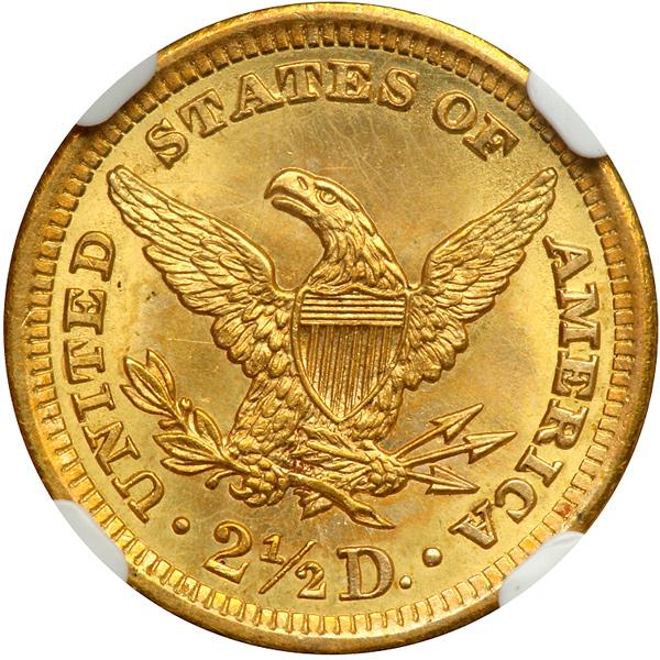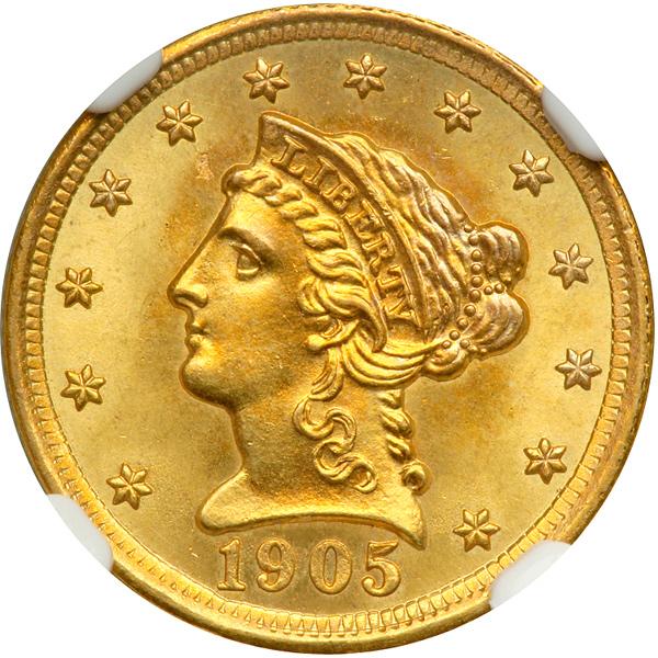 1905 $2.50 Liberty. NGC graded MS-66. Rich golden obverse toning. A sparkling Gem with satiny surfaces and a commanding strike (PCGS # 7857) .