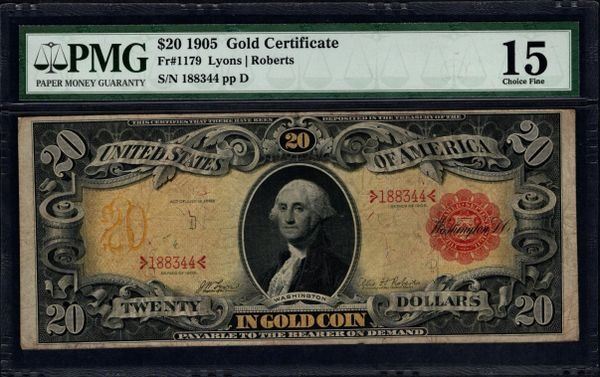 One 1905 $20 Gold Certificate PMG 15.