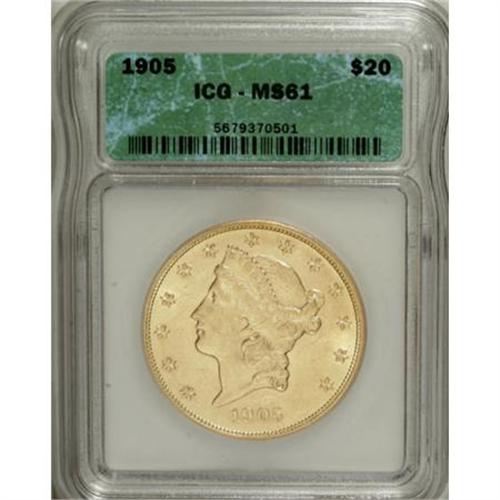 <B>1905 $20 MS61 ICG.</B></I> Philadelphia's high production of double eagles in 1904 led to saturation, and for the next year, that Mint struck only 58,919 pieces. This unworn yellow-gold representative has strong detail, though the surfaces host myriad abrasions.<BR><BR><B>Coin Engraver:</B> James B. Longacre<BR><BR><b>Shipping:</b> Coins & Currency (<a target="_blank" href="http://www.heritageauctions.com/common/shipping.php">view shipping information</a>)