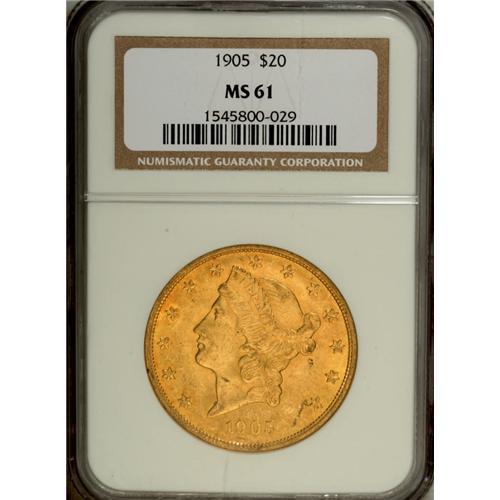 1905 $20 MS61 NGC. A mint state example displaying a n
